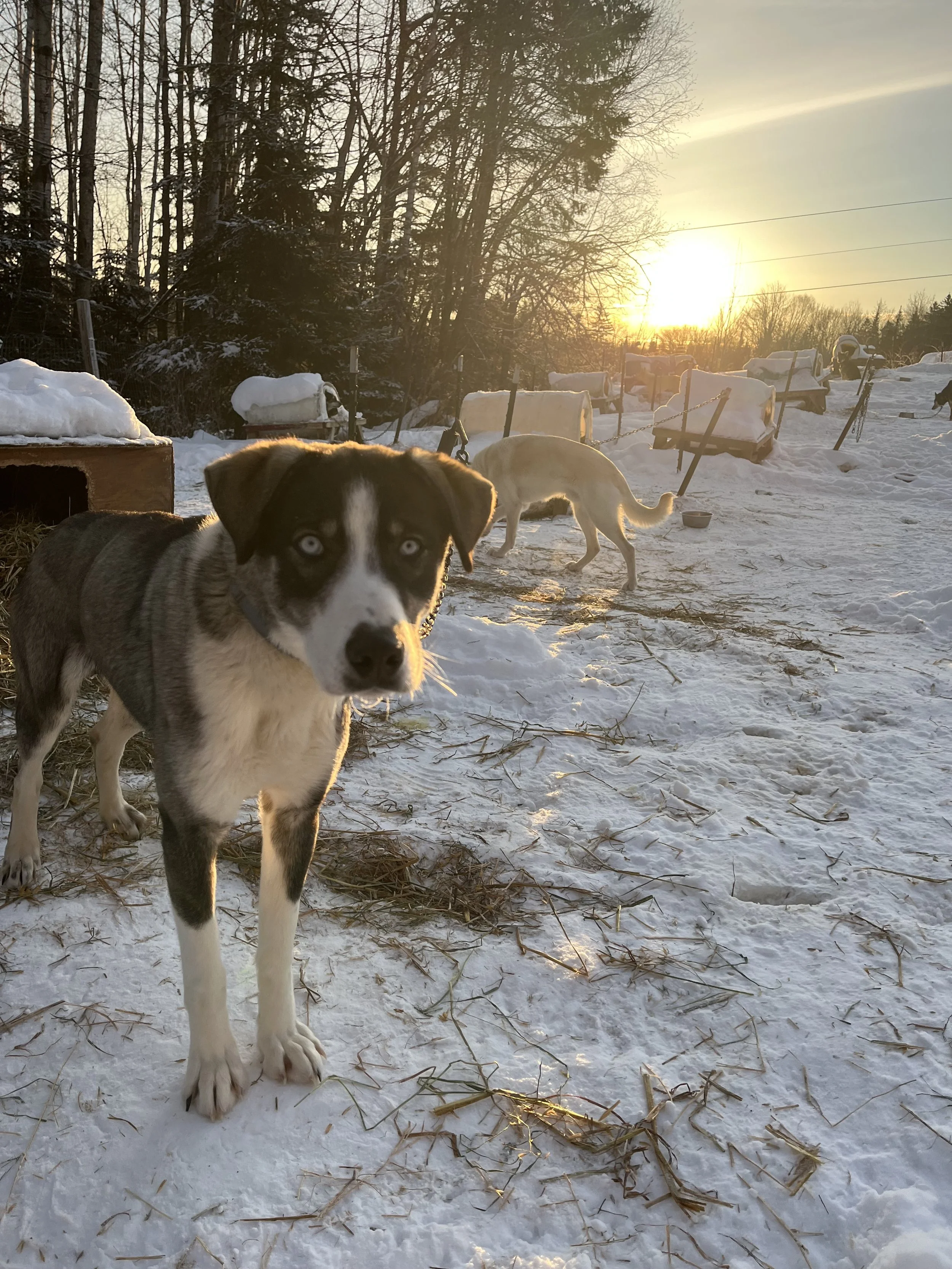 Buster lives next to his sister Slayer, and they are constantly playing. Buster and his siblings all require multiple platforms—which I call ‘party platforms’—to stand on and look across the yard. Buster takes this need to be on high one step further, and when we stop on the trail he can be spotted trying to stand on top of the gangline. A long muscular dog, Buster has been hanging out next to Oriana on the team, as the most neutral energy to balance his emotions.
