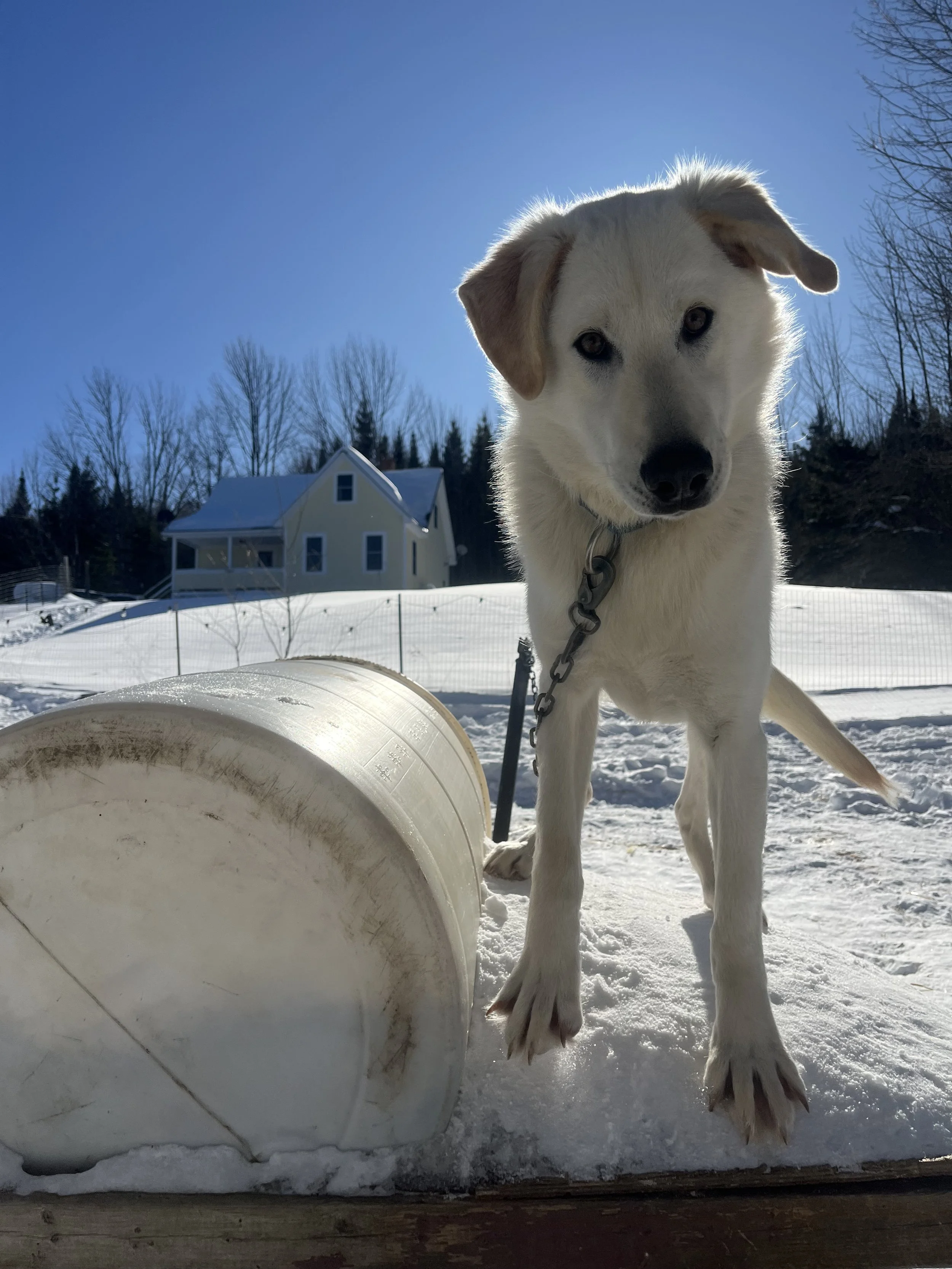 Clipper is one of the yearlings that has taken the longest to find his trot—and now that he has, he’s invisible in the team, a flat back trotting down the trail. Or, as invisible as a white dog can be in a sea of dark bodies. He has potential in the front, but has a complete lack of discipline, so if he’s in front of the team I can’t stop. Clipper is fine without stopping, so maybe there is a potential there!