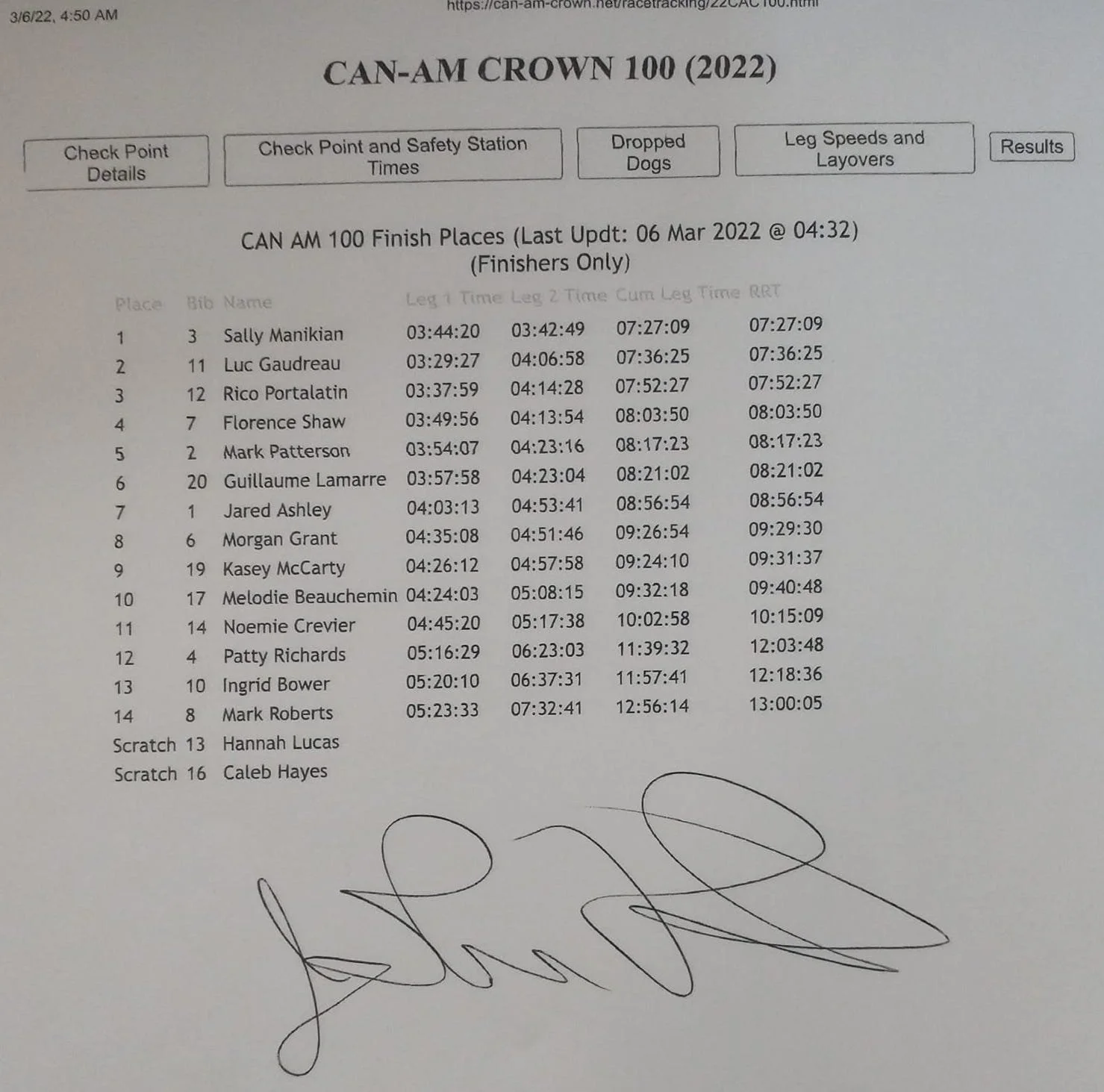 Sixth place (driven by Brianna Boiselle): Willie Jr/ Aurora, Marian/ Razz, Squan/ Skee, Orchid/ Tap Tap. 5 hr37 min